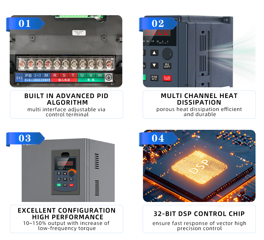 PQ580 系列是专为工业自动化领域设计的高性能通用变频器,广泛应用于风机、泵、输送机、机床等设备。其核心采用先进的矢量控制技术,具有高精度调速、节能高效、运行稳定等特点,可满足多种工业场景的需求。适用于三相交流异步电机和永磁同步电机。