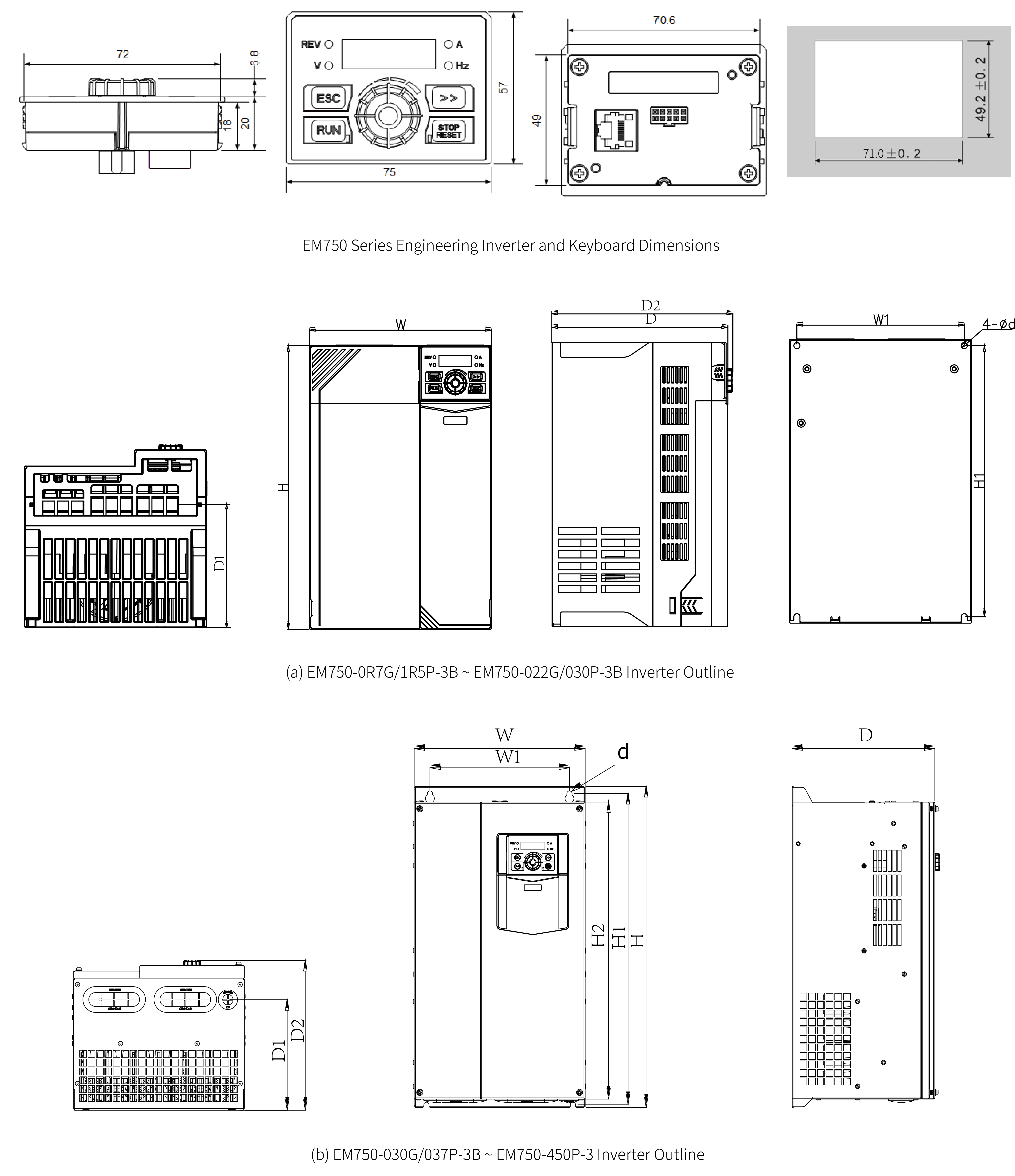 | 逆变器型号 | 功率容量 | 输入电流 | 输出电流 | 自适应电机 | 外围尺寸 | 安装孔径 | 外墙 | ||||